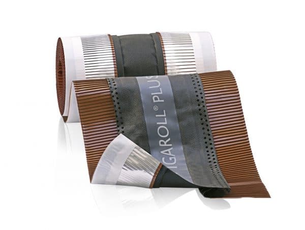 Εξαερισμός κορυφογραμμής Figaroll Plus®, Braas. Εύκαμπτη ταινία κυμαινόμενου πλάτους 28-32 cm αποτελούμενη από δύο τμήματα :α) Εξωτερικό τμήμα με αλουμίνιο / PET πολυεστερικής βαφής .Στις άκρες έχει μαστίχη για τη συγκόλληση στα κεραμίδια.β) Μεσαίο τμήμα : Μαύρο PP-Fleece, υδροφοβικό, με ειδική λαβυρινθοειδή σχεδίαση που επιτρέπει τον εξαερισμό (Ικανότητα εξαερισμού >150 cm2 /m).