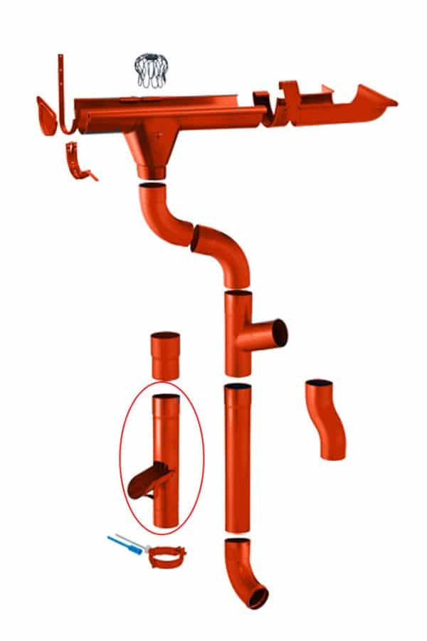 Ο νεροχύτης παρεμβάλλεται στο σωλήνα και με έξυπνο τρόπο οδηγεί τα νερά της βροχής για να γεμίσουμε ένα βαρέλι ή για να τα οδηγήσουμε με κάποιο κανάλι σε ένα άλλο σημείο. Στη μία άκρη έχει μούφα (διαστολή) για την εύκολη σύνδεση με το σωλήνα
