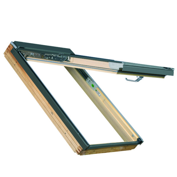 Ενεργειακό παράθυρο στέγης FPP V-U3 από τη FAKRO με καινοτόμο μηχανισμό που επιτρέπει το άνοιγμα του παραθύρου με δύο διαφορετικούς τρόπους.