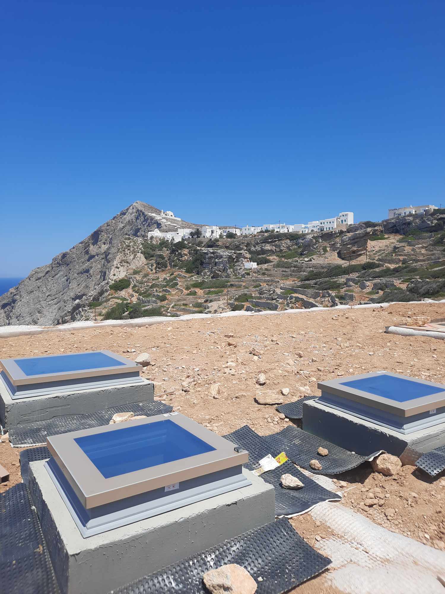Σε υπόσκαφη κατοικία στις Κυκλάδες, η τοποθέτηση παραθύρων ταράτσας / Skylights FAKRO προσέφερε φυσικό φως στους εσωτερικούς χώρους αναδεικνύοντας την αρχιτεκτονική μοναδικότητα του κτιρίου.